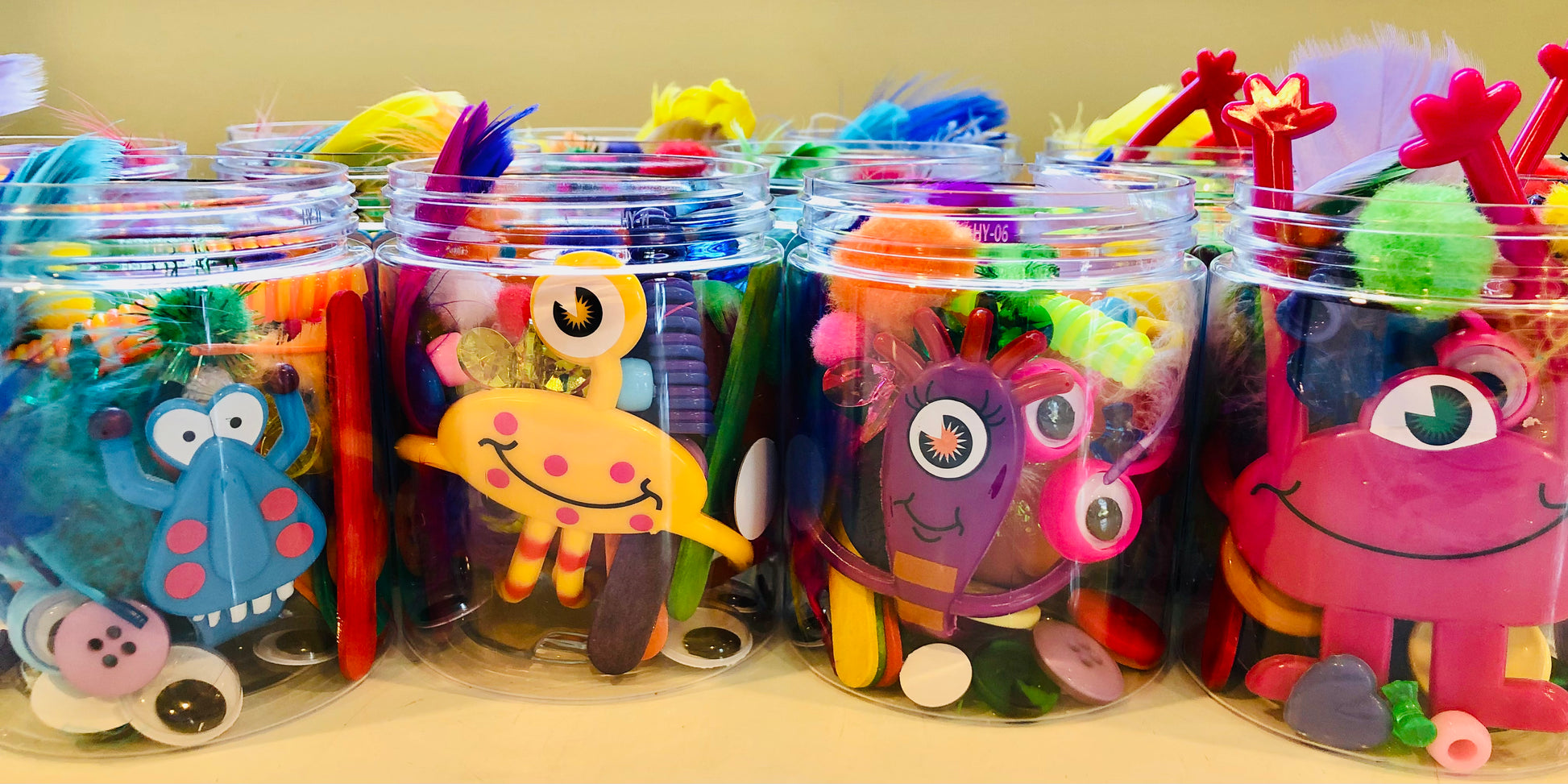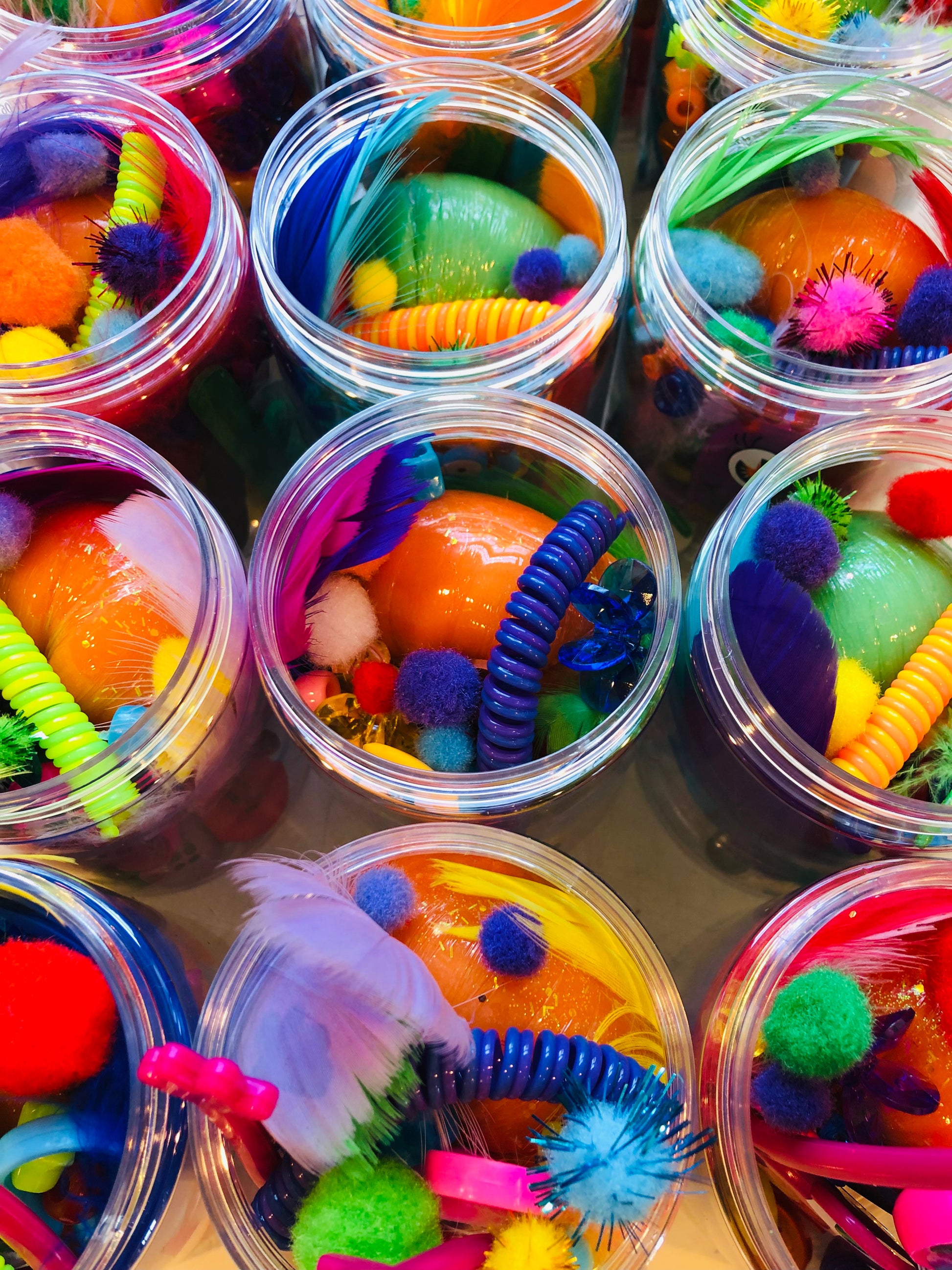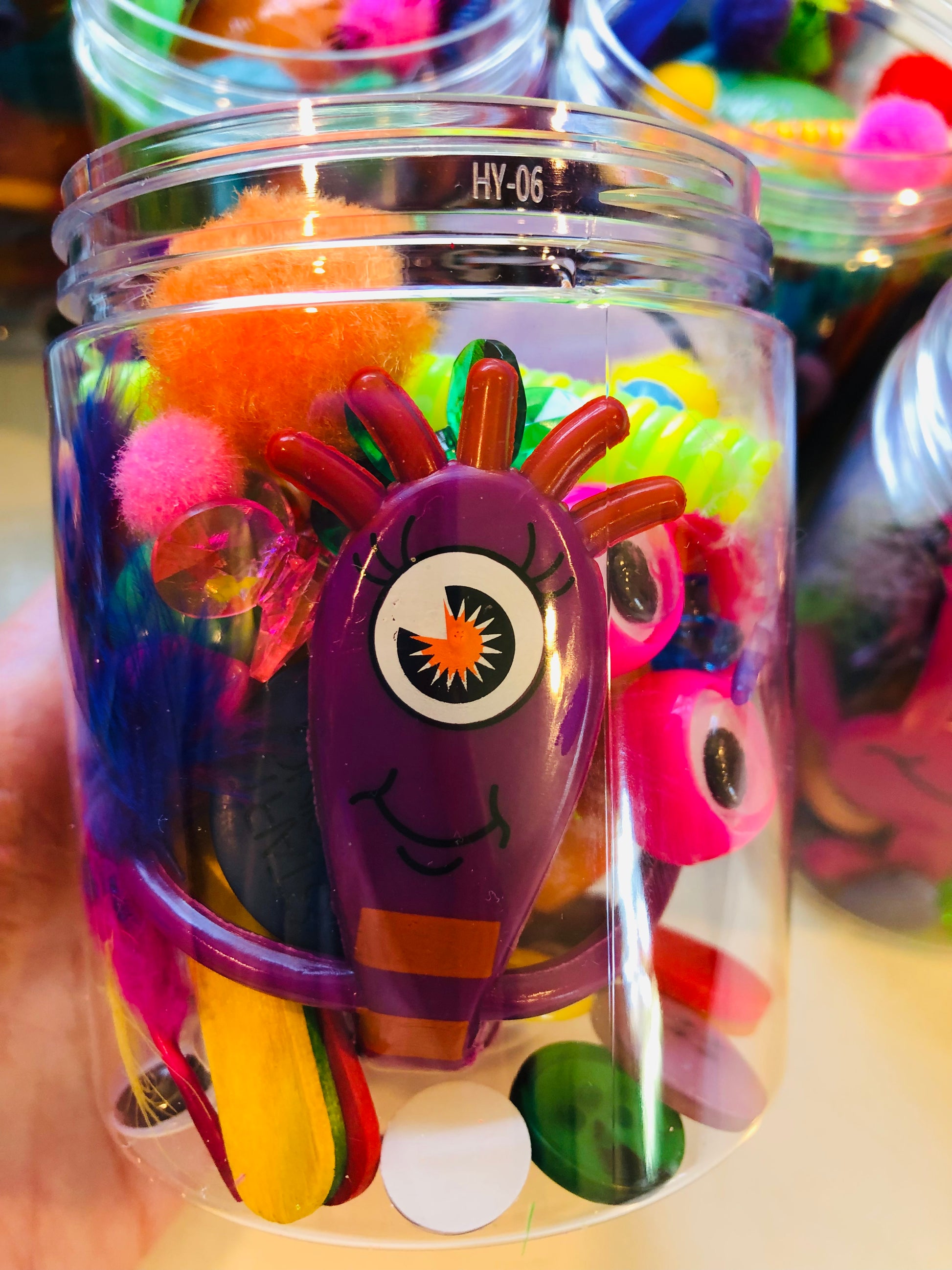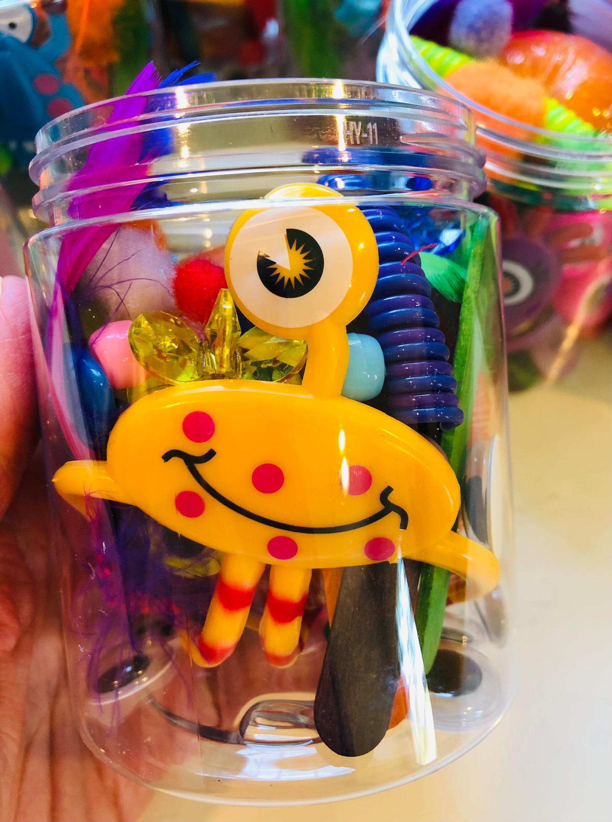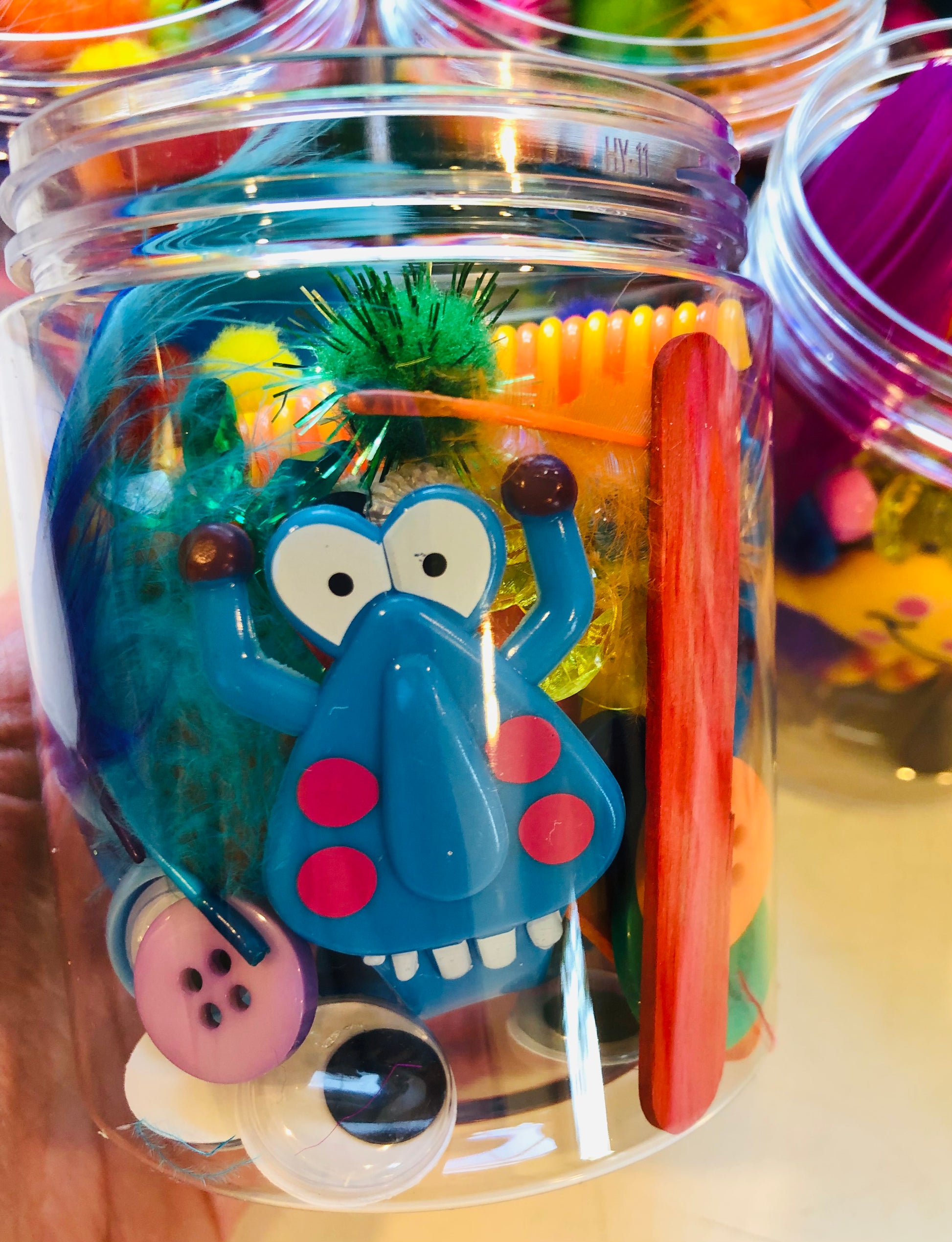 Our monster dough jar allows you to bring the magic of sensory play with you wherever you go. This 8oz jar is packed with items that are sure to engage and excite your little one. Handmade dough in the back and goodies in the front.