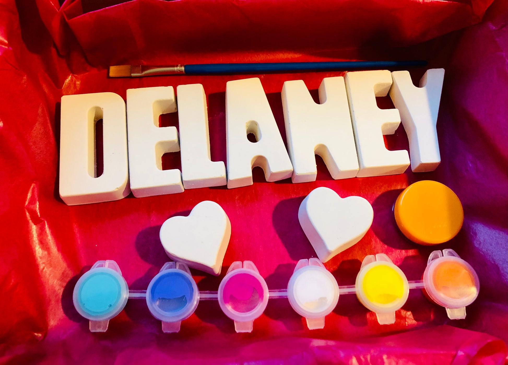 Personalized paint your own name kits make a wonderful custom gift for kids. Each kit includes plaster name set, 6 paint pots, 1 paint brush, 1 glitter pot, and 1 glitter glue.