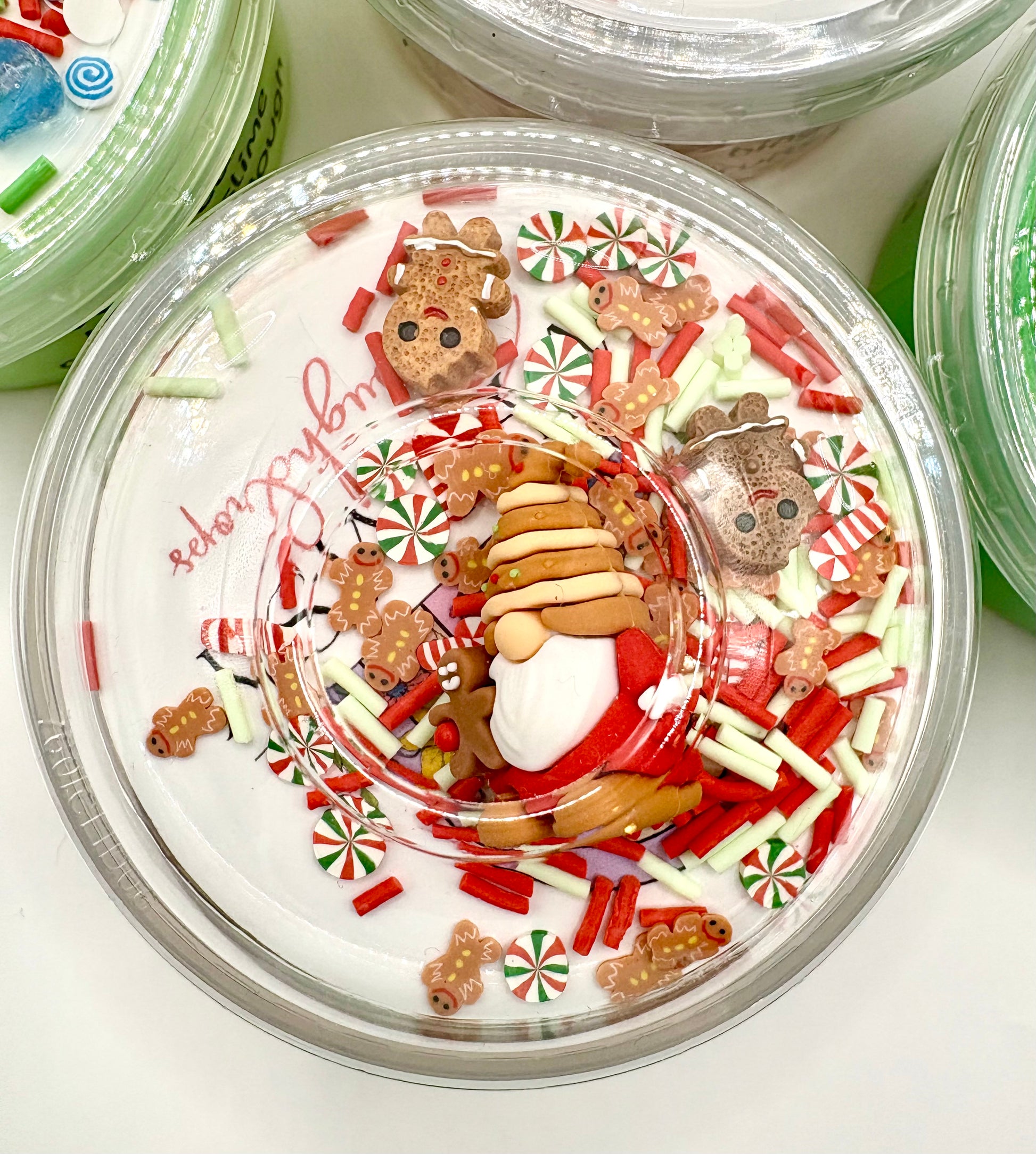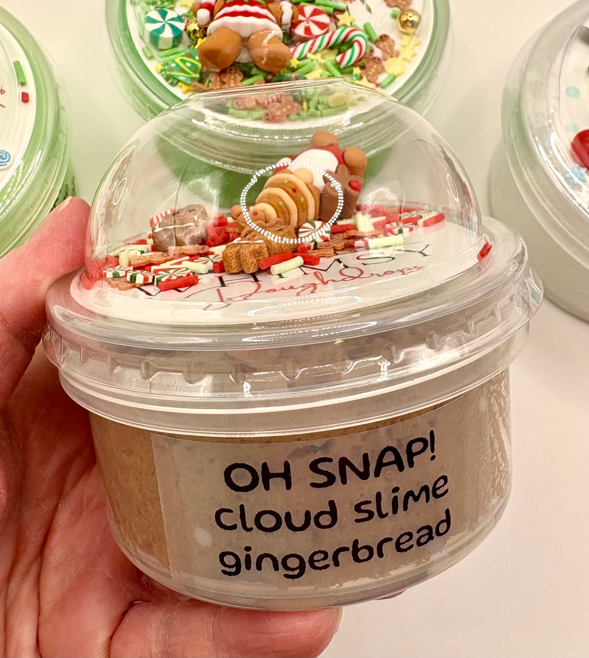 A fluffy cloud slime scented like gingerbread and topped with the cutest gnome figure. Gotta love the gnomes!!