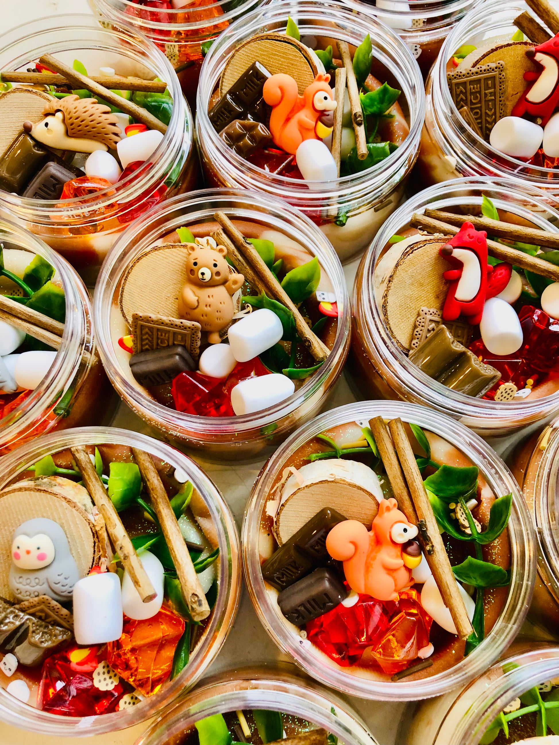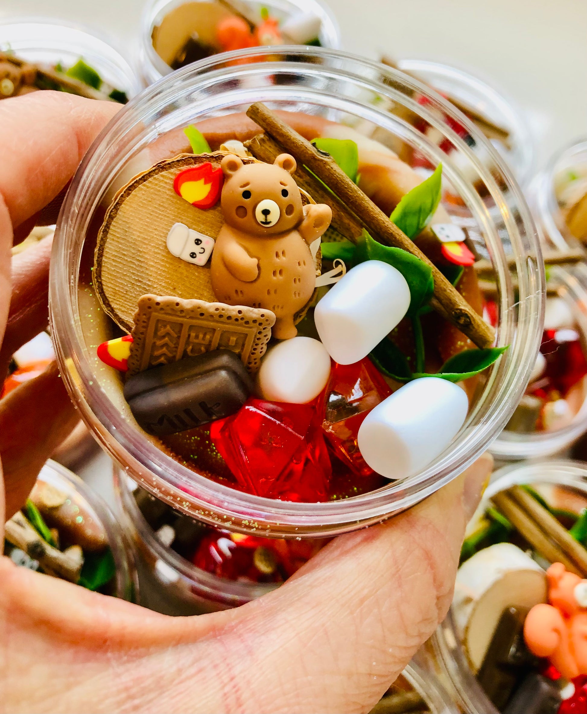 S’mores dough jars with a chocolate marshmallow swirly scented dough and all the cute campfire fixings to keep kids happy and playing all summer long!