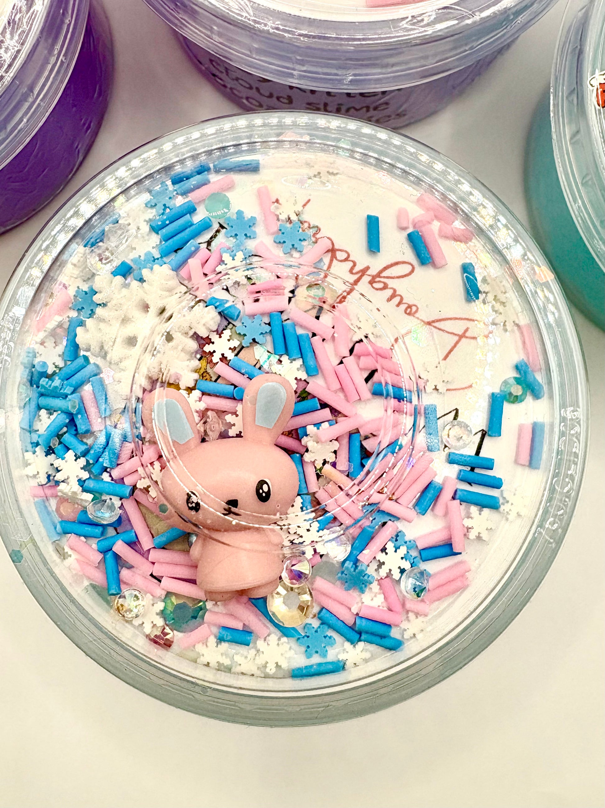 This snow bunny is ready to hit the slopes!! A fluffy cloud slime scented like vanilla sugar and topped with a cutie bunny and snowflake sprinkles to decorate your slime